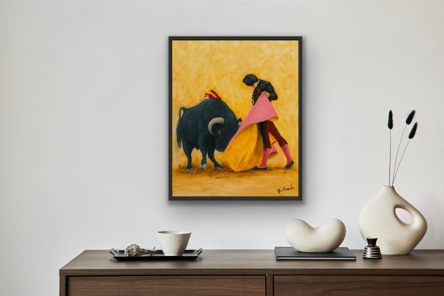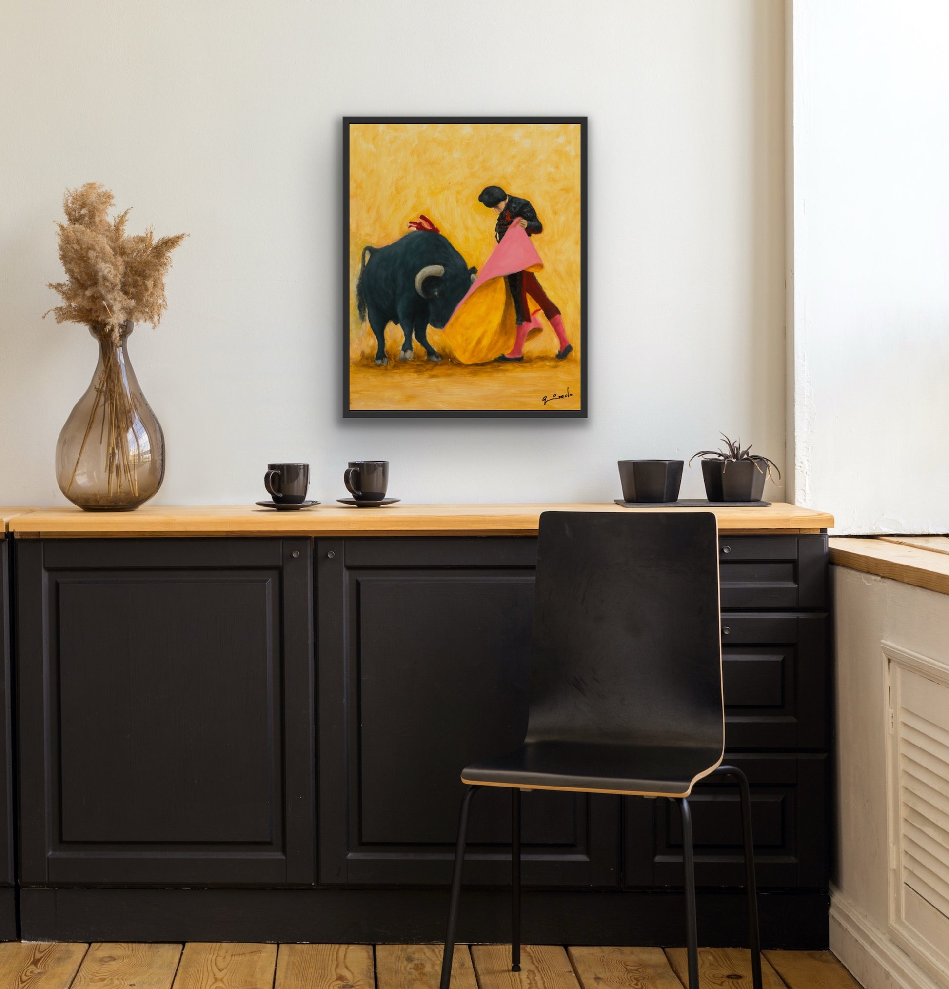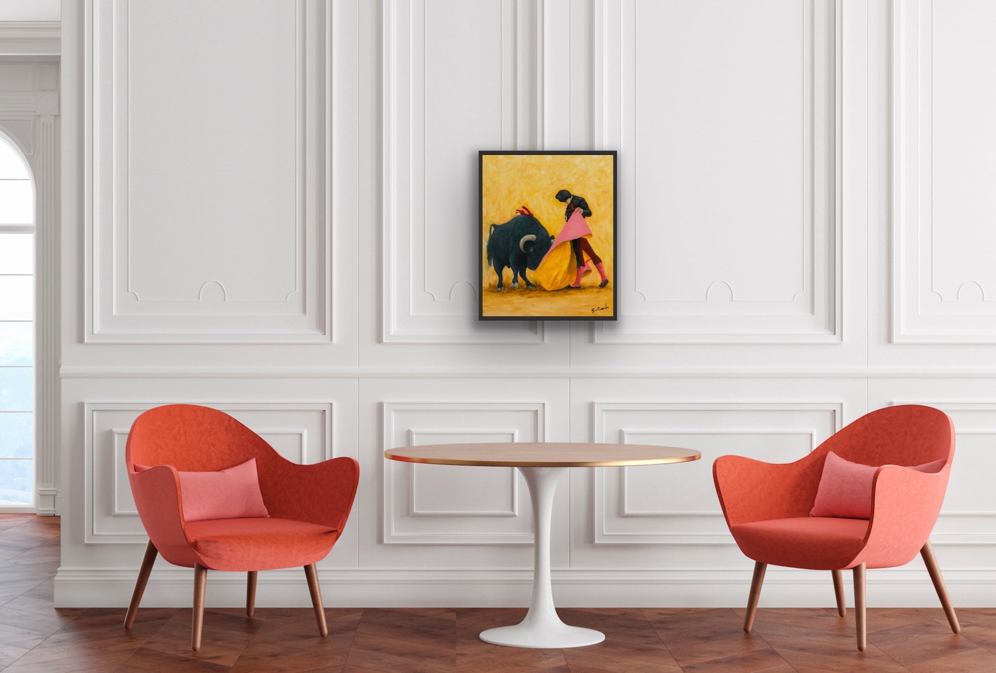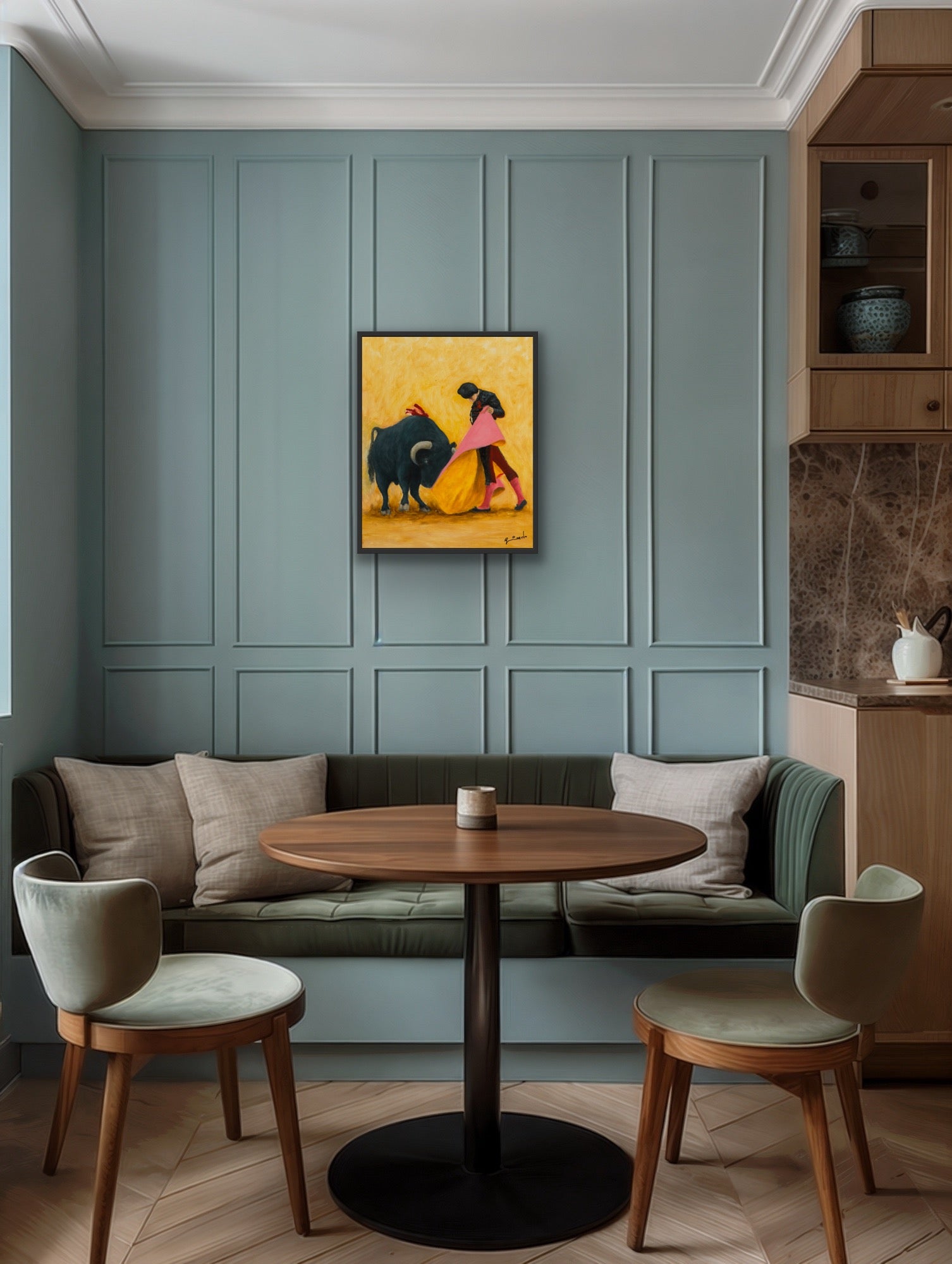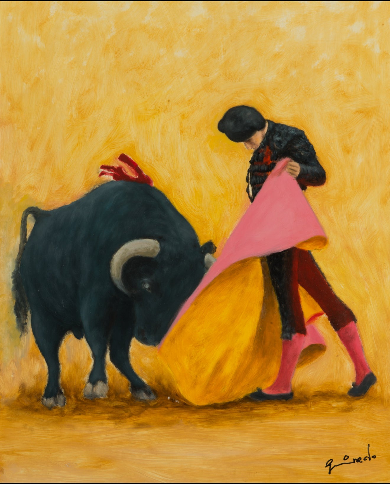 In Alberos I, Guirado returns to the golden arena of his Spanish youth. With reverent brushwork and symbolic composition, he captures the iconic moment of confrontation between bull and matador — a poetic balance of courage, grace, and danger. Painted with a rich ochre backdrop, the work radiates warmth, heritage, and theatrical tension.