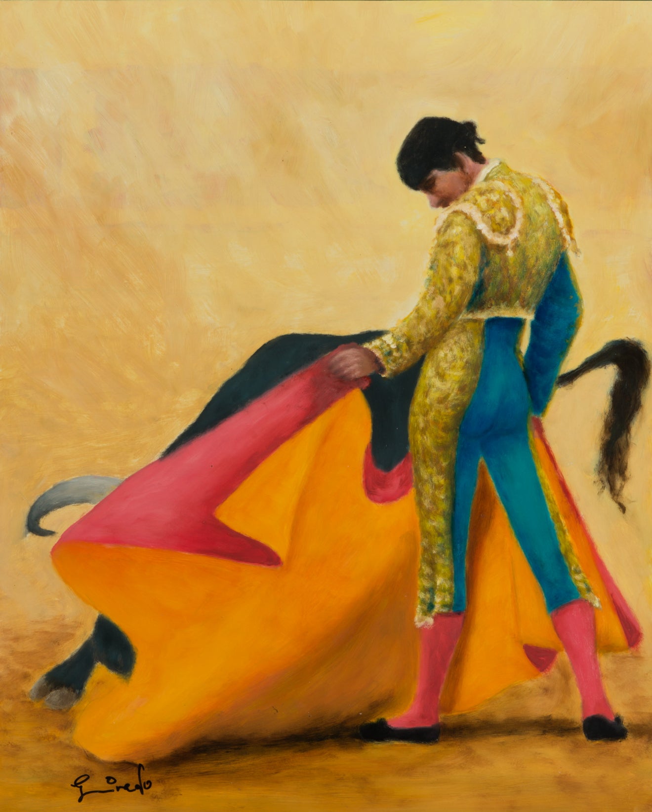 A rare and vibrant work from Guirado’s Spanish Heritage series, Alberos IV captures the ceremonial elegance and hypnotic intensity of the bullring. With its sweeping gestures and saturated palette, the composition blends romanticism with folkloric realism — a tribute to Guirado’s Andalusian upbringing and his fascination with cultural rituals.