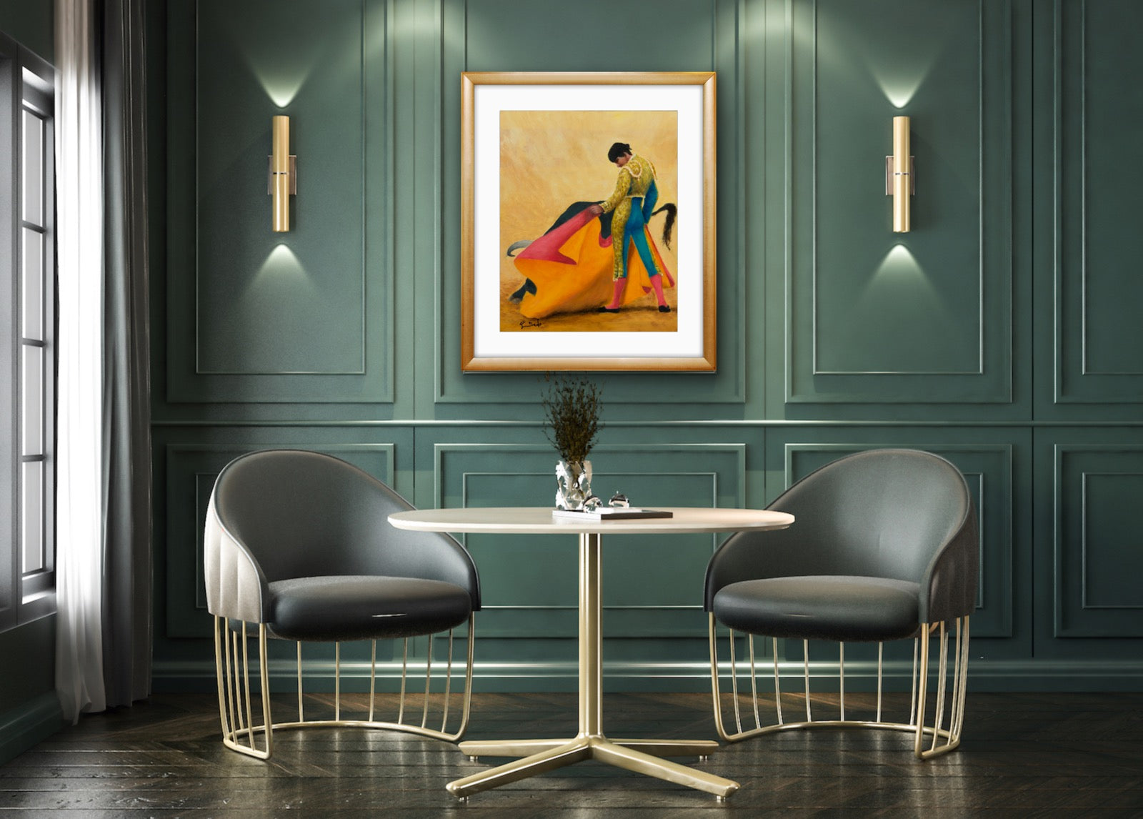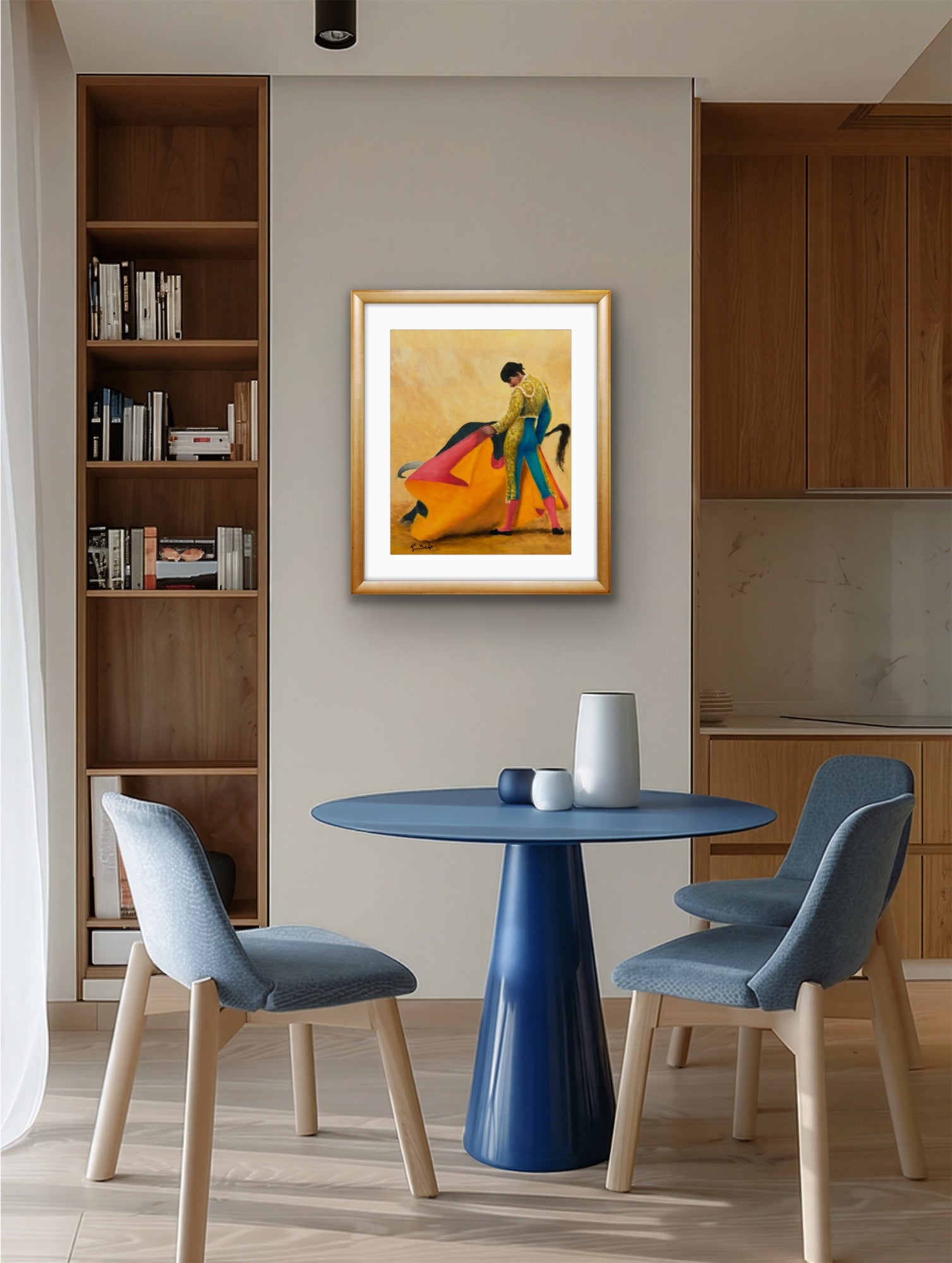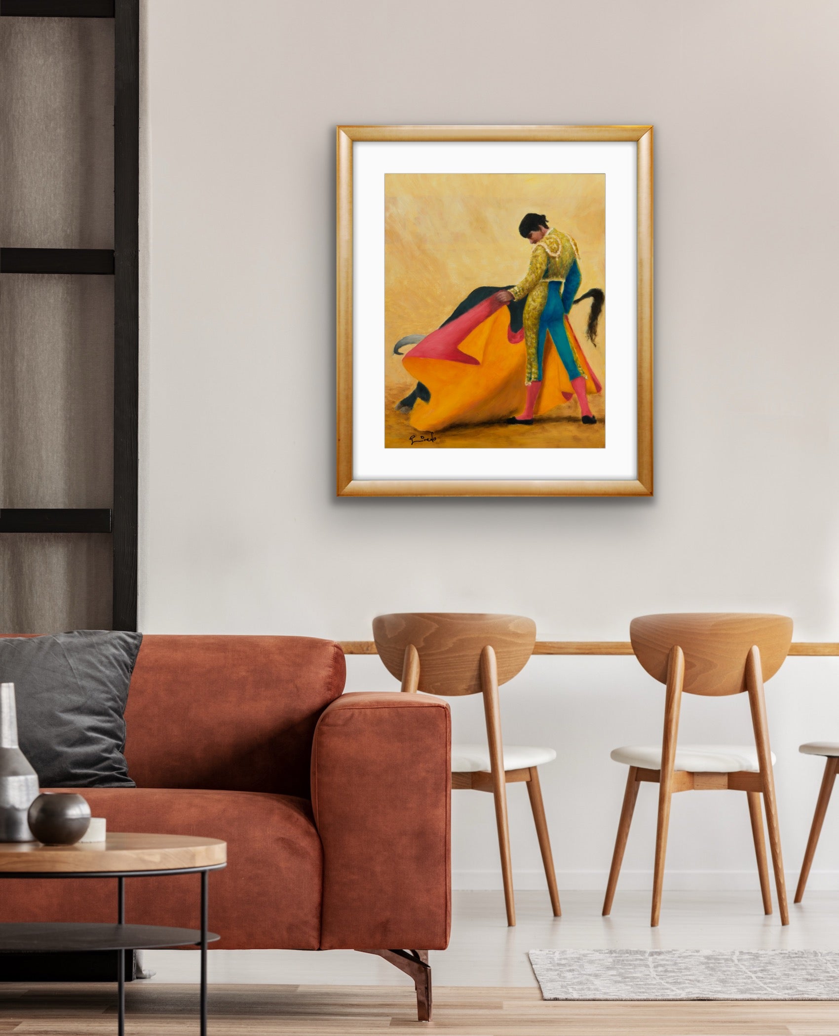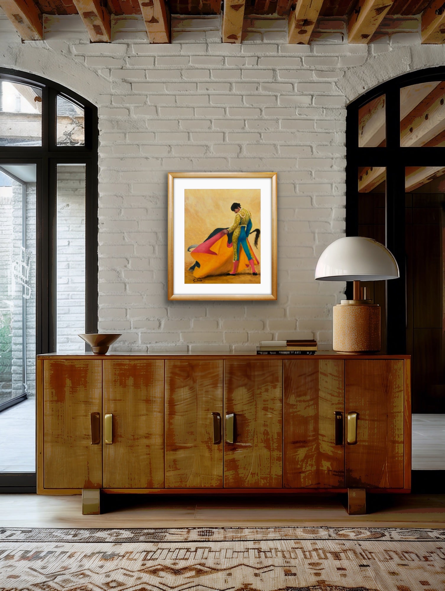 Part of a small suite of bullfighting paintings that celebrate the pageantry of Spanish tradition, Alberos IV pairs beautifully with other works in this series or stands alone as a striking interior focal point.