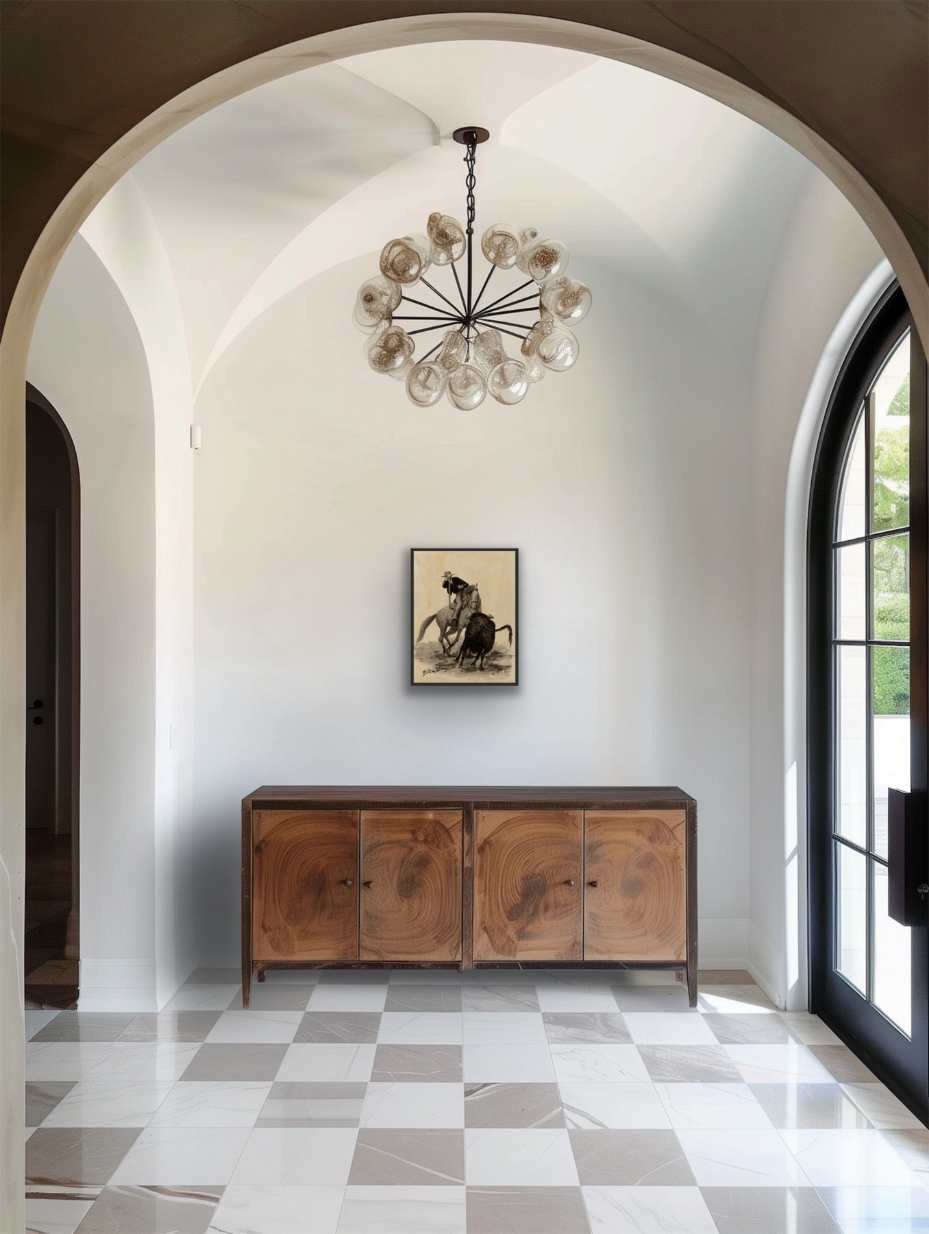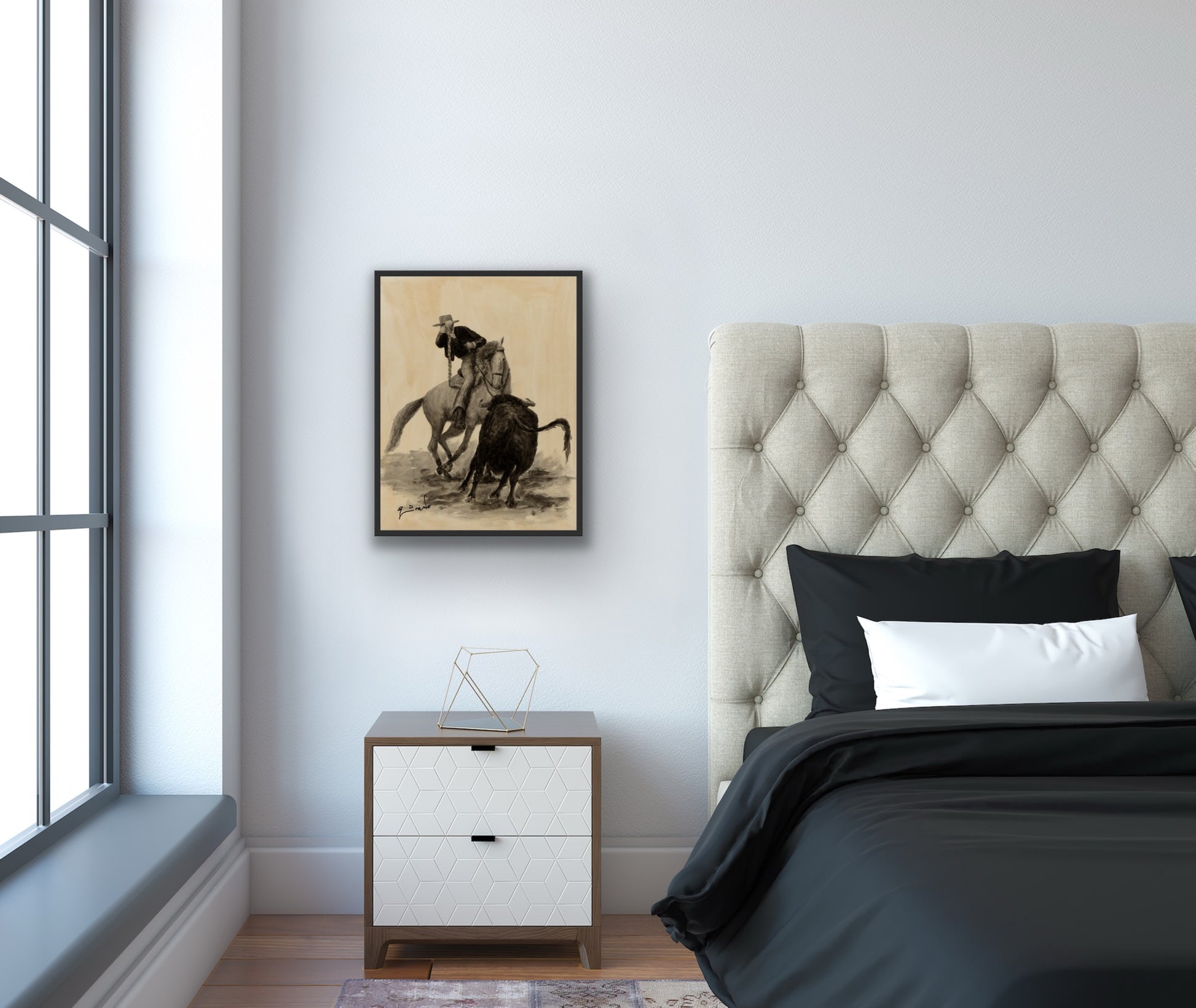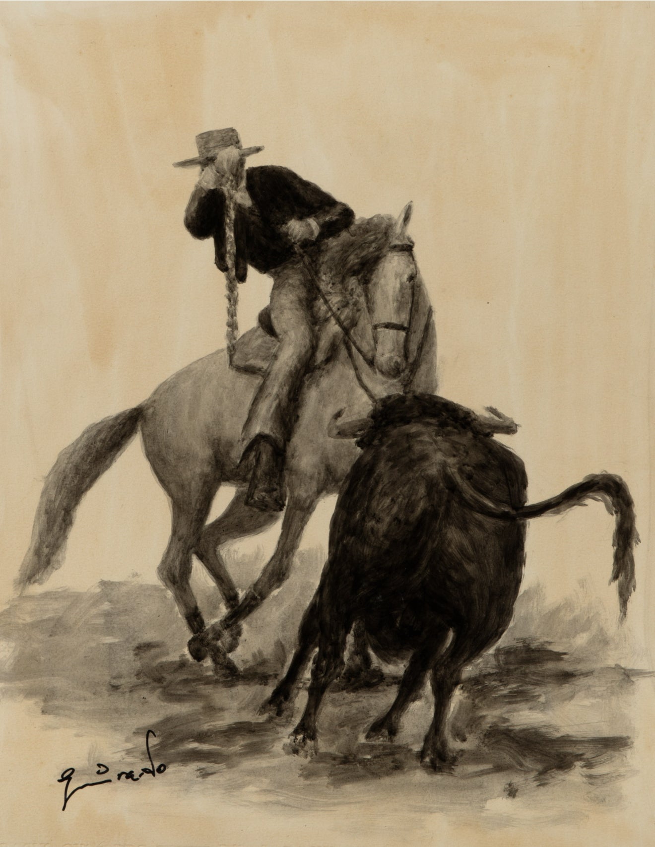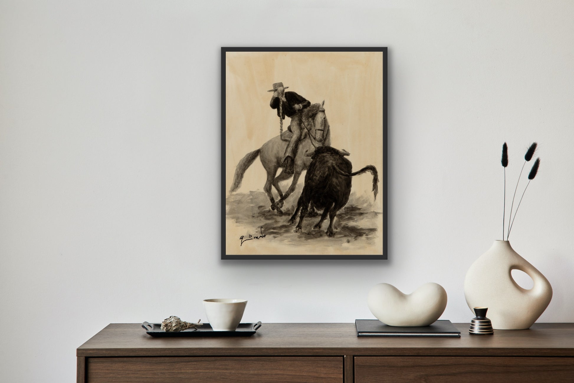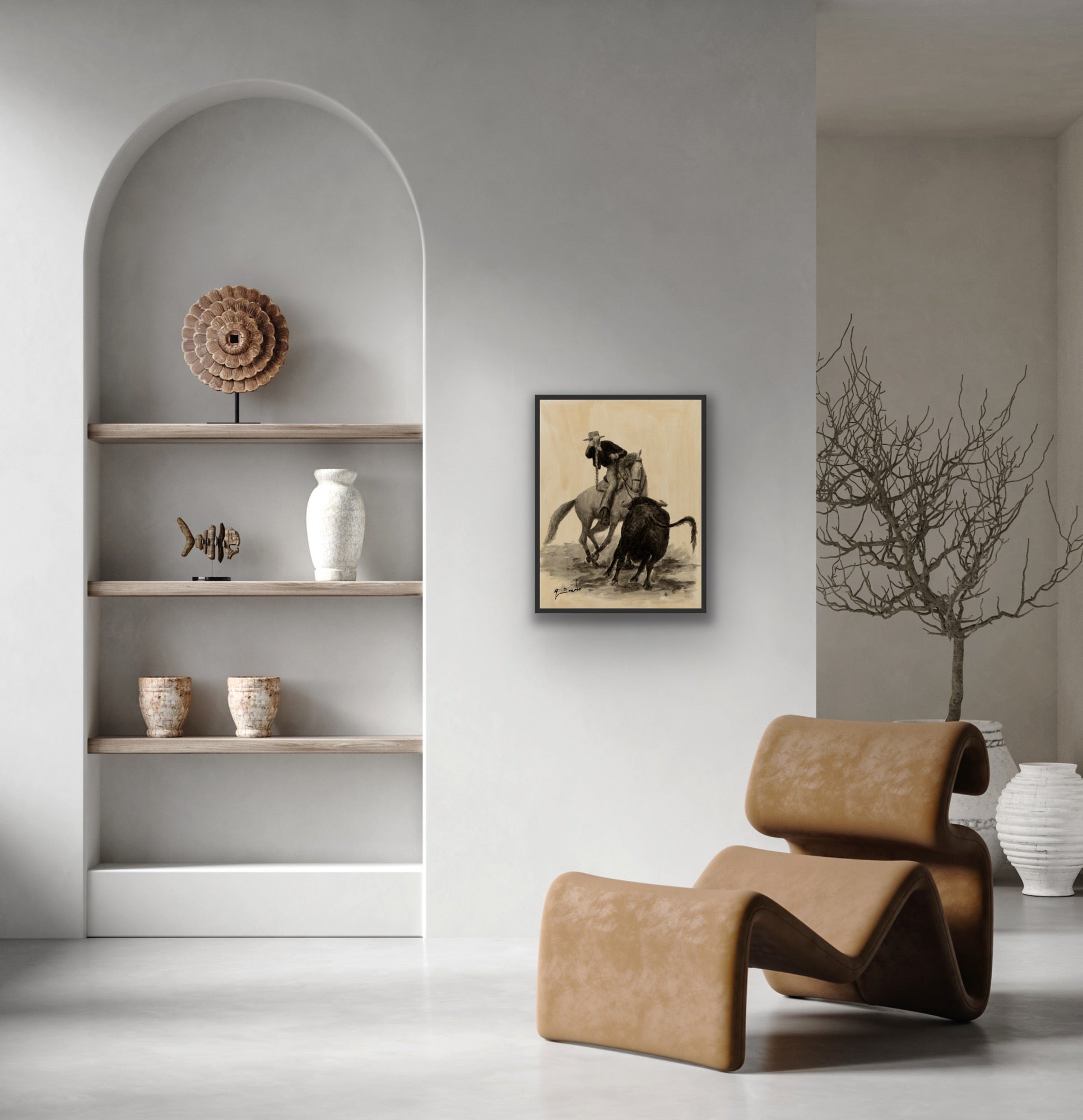 A striking monochrome work, Alberos XVI captures a moment of high tension between horse, rider, and bull — rendered with an expressive, almost cinematic intensity. Unlike the vibrant ochres and reds of Guirado’s other Spanish heritage pieces, this one is executed in black and sepia tones, evoking the rawness and stark drama of traditional Spanish bull culture.