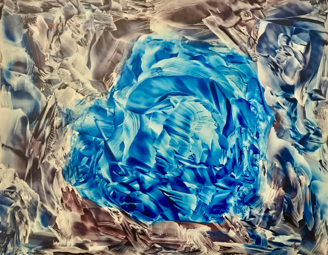 An intense study of texture and chromatic movement, Effecto envelops the viewer in a vortex of electric blue surrounded by waves of white, grey, and plum. Painted in 1998, this abstract work expresses Guirado’s fascination with energy fields and spiritual portals.