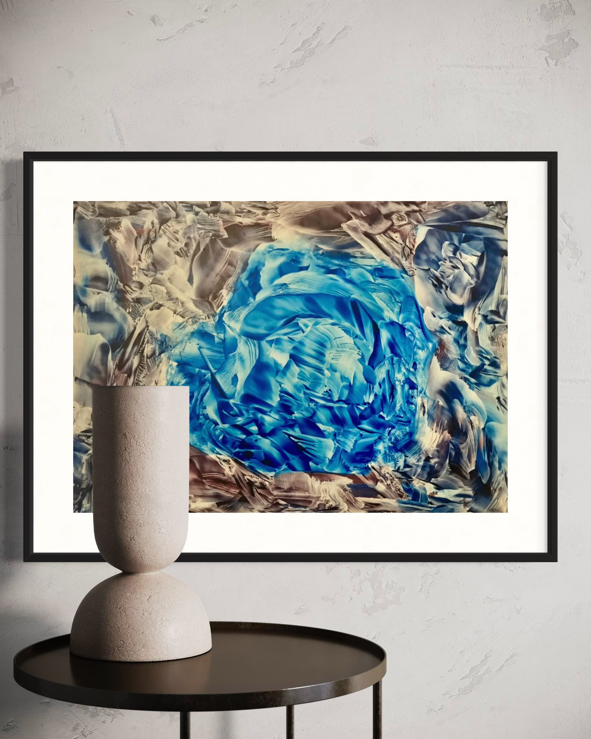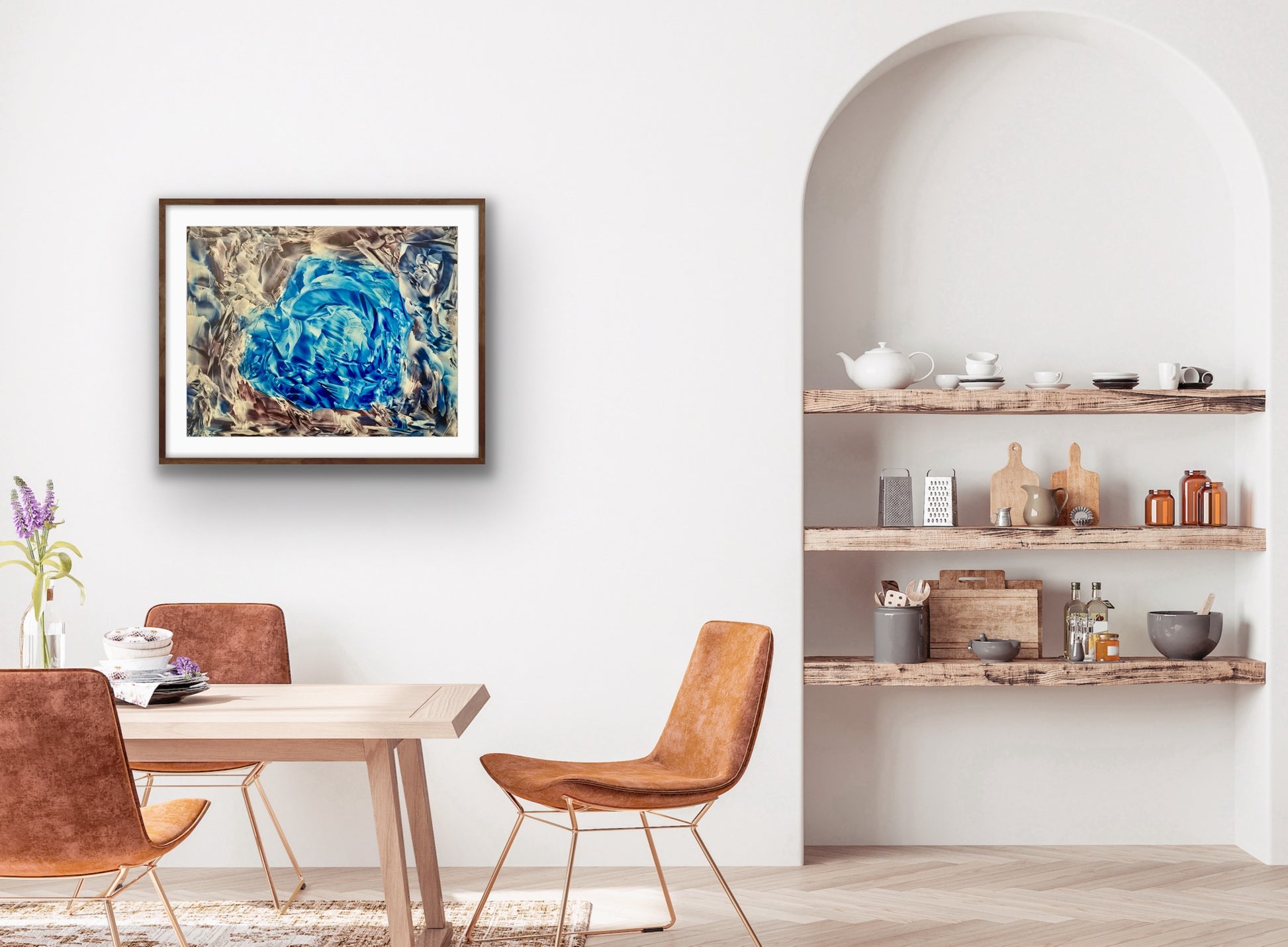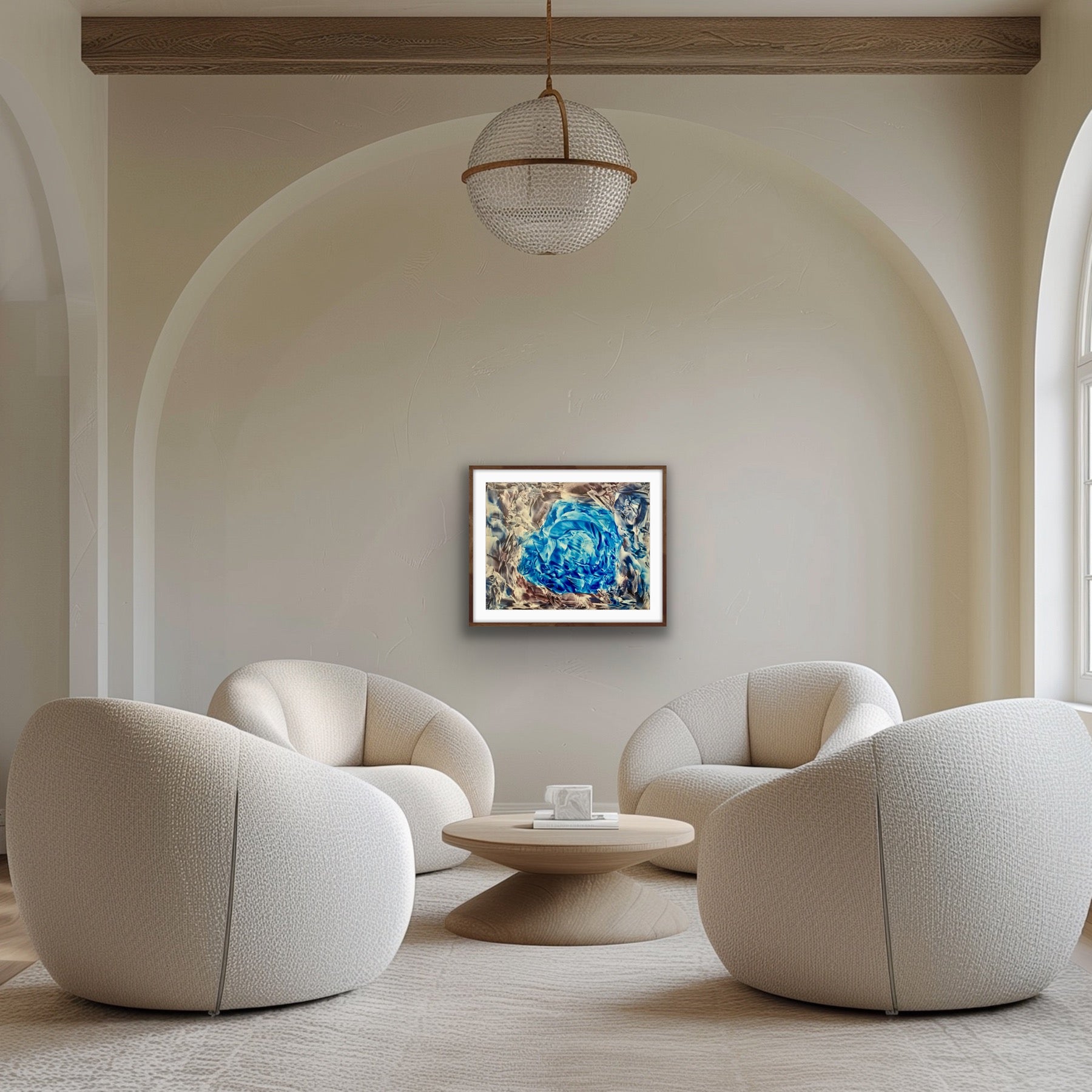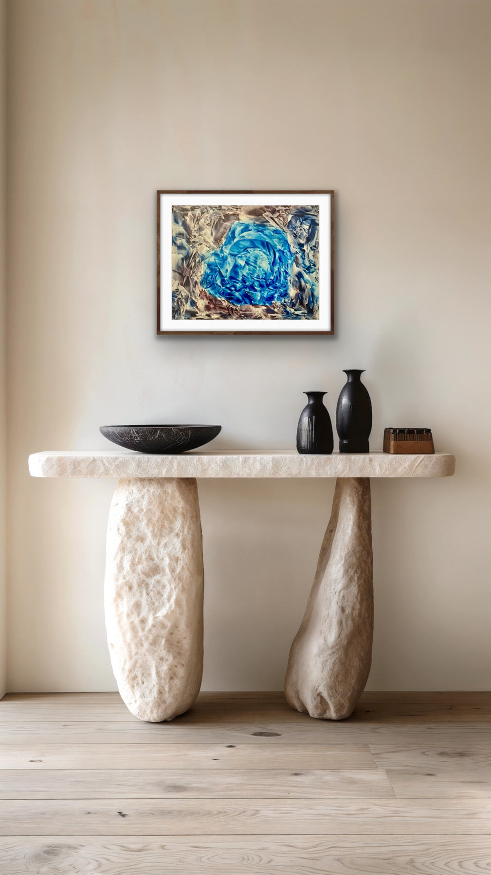 The central blue mass pulses with vitality — a visual echo of the third eye, inner awareness, or a gateway to higher perception. Rich in gesture and emotive layering, Effecto stands as a striking testament to Guirado’s later-period mysticism and mastery of oil.