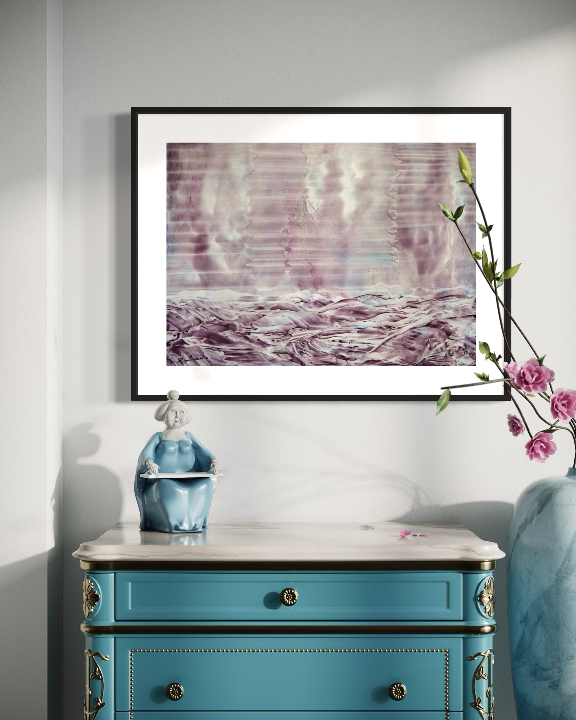 A radiant work from Guirado’s later period, Energy Vibration captures the unseen pulses of light and sound that shape our inner and outer worlds. Rendered in a hypnotic interplay of lilac, silver, and spectral white, the painting evokes the ethereal beauty of energy in motion — a meditation on the invisible forces that connect us.