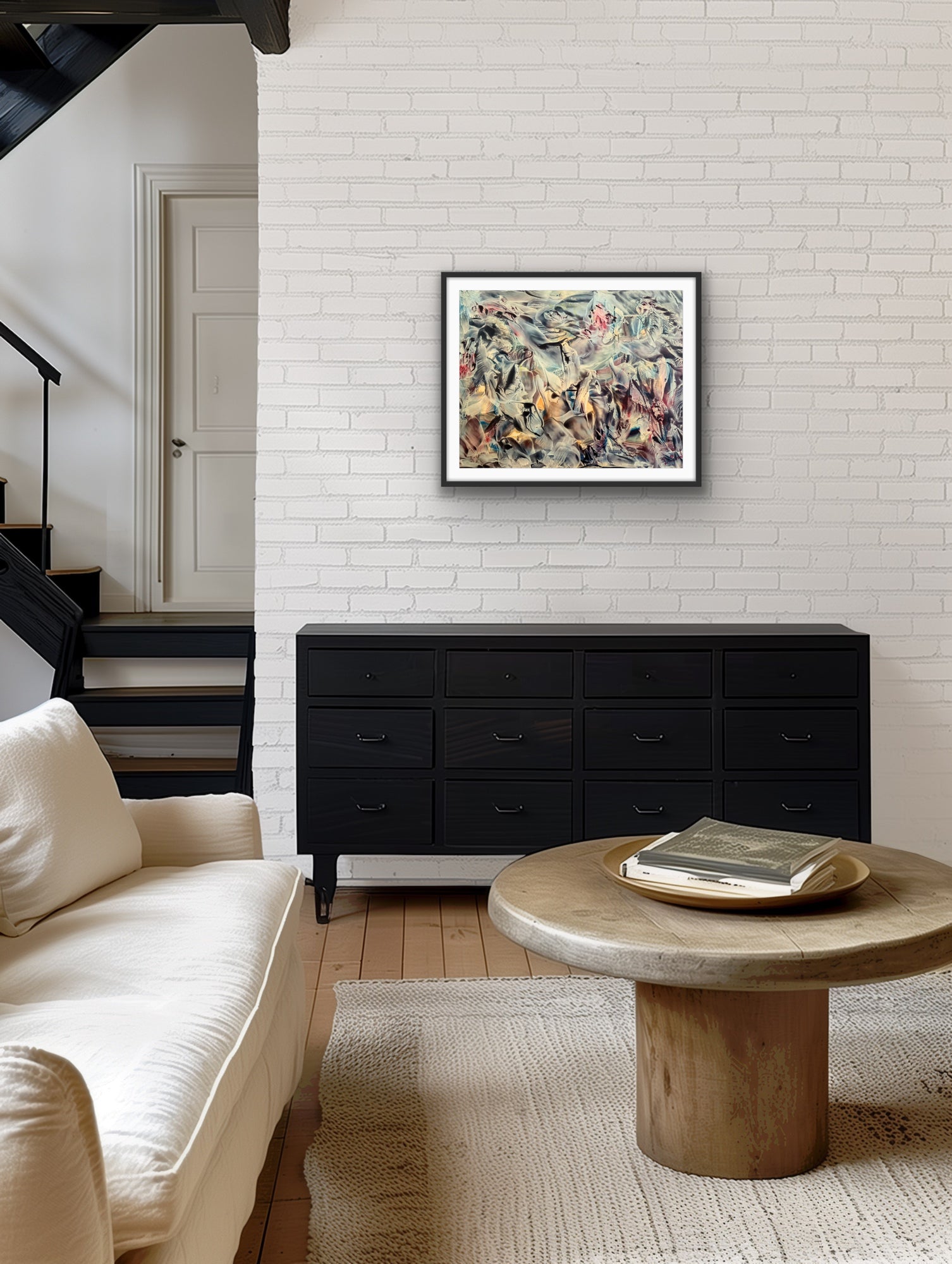 A deeply elemental composition from Guirado’s late ’90s period, Origen pulses with symbolic intensity and gestural elegance. Painted in rich earth tones and layered brushwork, the piece evokes the primordial forces of creation — earth, fire, water, and consciousness — converging into a metaphysical landscape that blurs the line between outer terrain and inner vision.